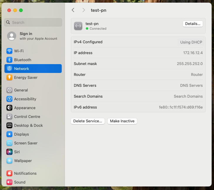 No configuration is required for your Mac mini's IP address on the Private Network, as this is automatically managed by Scaleway DHCP. You can view the IP address in the Scaleway console, in the Mac mini's Private Networks tab.