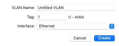 - Enter a VLAN name of your choice, the VLAN ID from step 1 in the Tag field, and Ethernet as the interface. Click Done.
