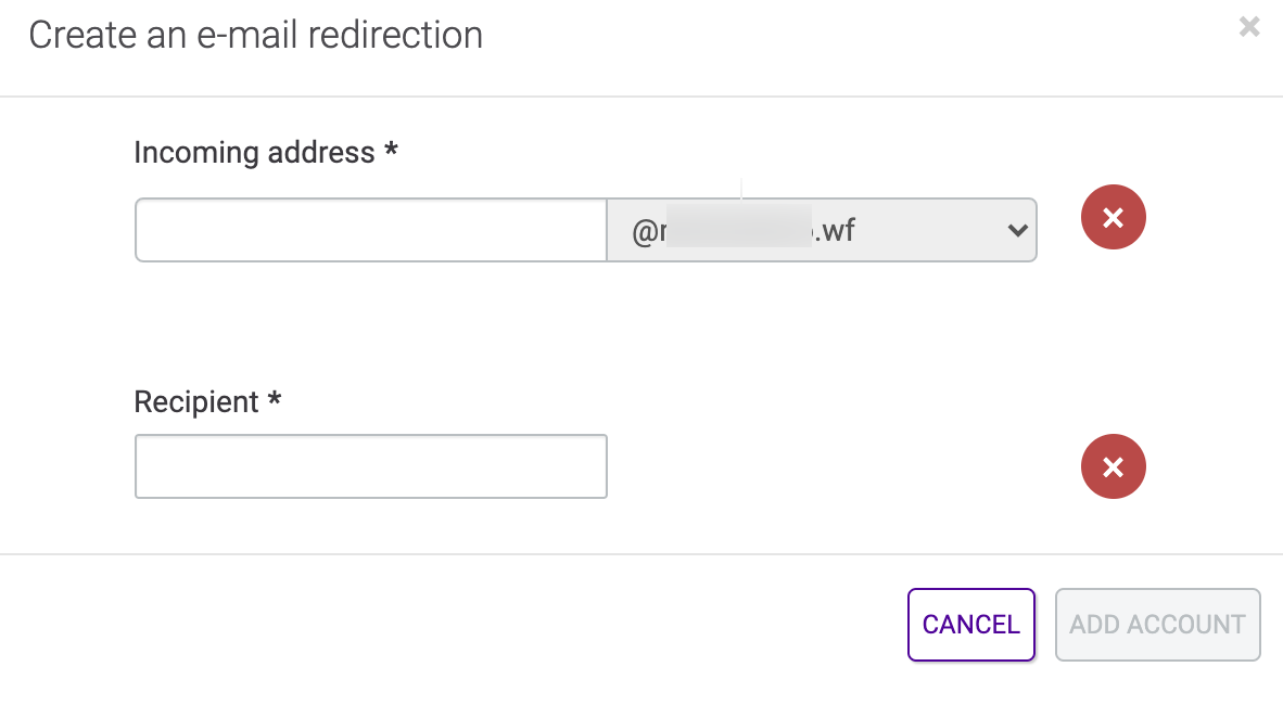 Enter the required information for the alias (the name of the redirection and the recipient) to create the redirection.