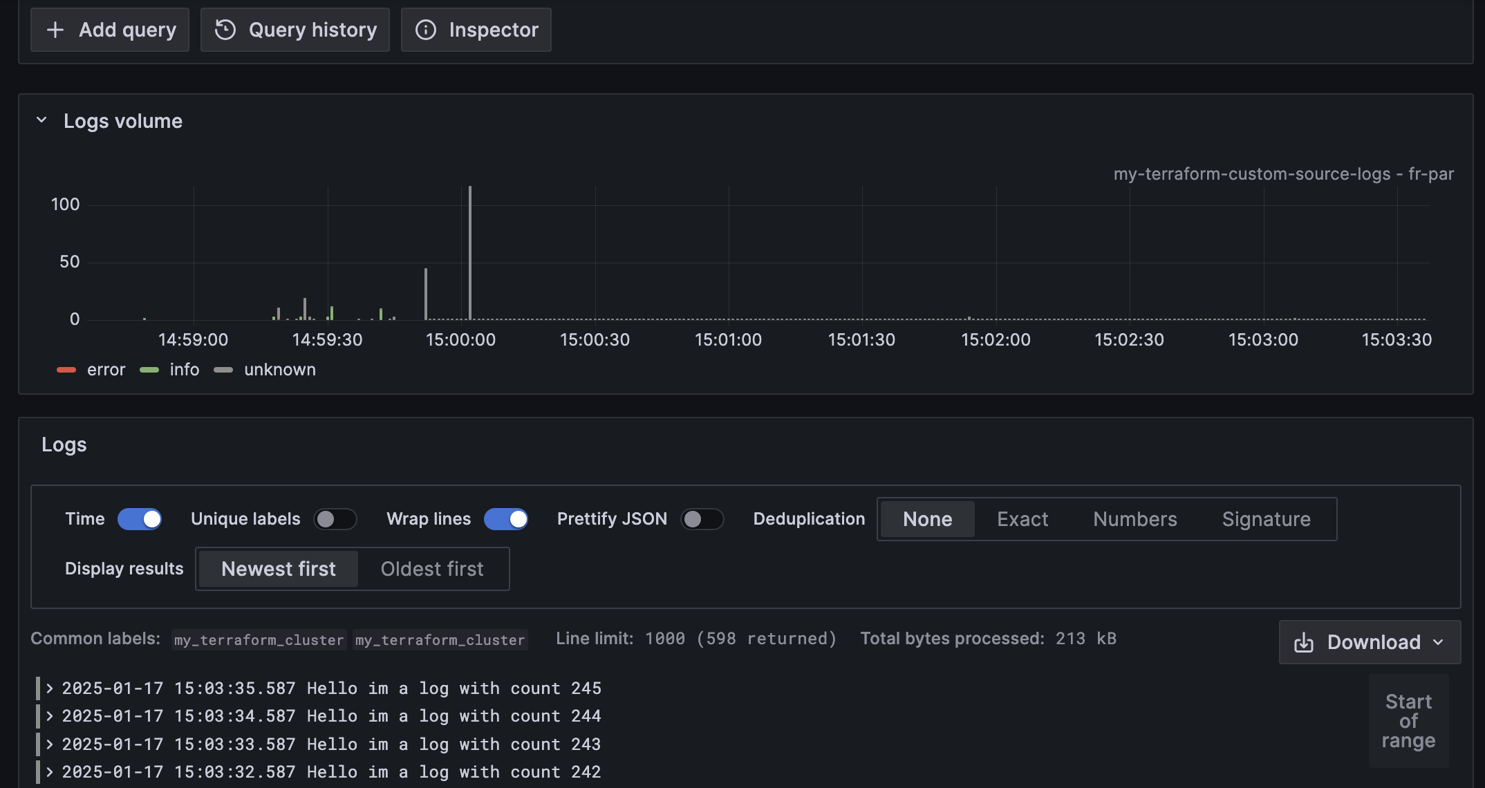 Create a values.yml file to configure your Helm chart, using the example below. Make sure that you replace $SCW_CLUSTER_NAME with the name of your Scaleway Kubernetes cluster, COCKPIT_CUSTOM_LOGS_DATASOURCE_URL with the URL of your custom logs data source (you can find it under the "API URL" section in the Data sources tab of the Scaleway console), and $COCKPIT_TOKEN with your Cockpit token.