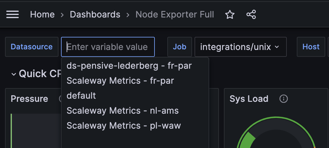 cockpit.alloy:prometheus.exporter.unix "node" { set_collectors = [ "uname", "cpu", "cpufreq", "loadavg", "meminfo", "filesystem", "netdev", ] } prometheus.scrape "node" { scrape_interval = "60s" scrape_timeout = "4s" targets = prometheus.exporter.unix.node.targets forward_to = [prometheus.remote_write.cockpit.receiver] } prometheus.remote_write "cockpit" { endpoint { url = "https://xxxxxxxx-xxxx-xxxx-xxxx-xxxxxxxxxxxx.metrics.cockpit.fr-par.scw.cloud/api/v1/push" headers = { "X-TOKEN" = "COCKPIT_TOKEN_SECRET_KEY", } } } - Replace