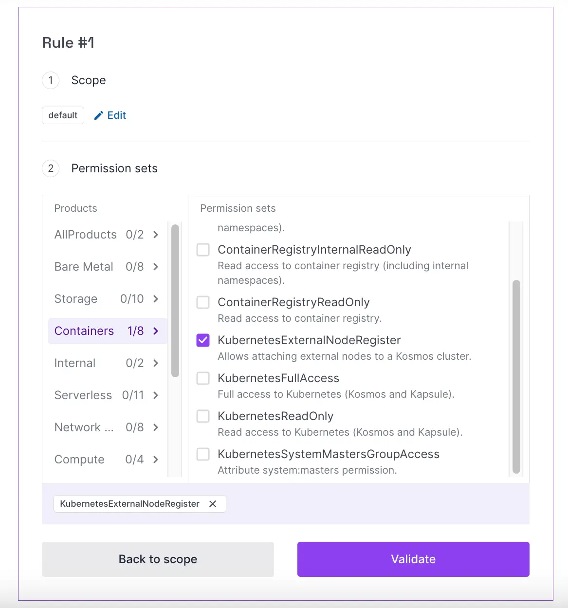 In order to add external nodes to your multi-cloud cluster, you must first create a multi-cloud pool. For security reasons, it is recommended to configure an API key with the KubernetesExternalNodeRegister IAM permission set.