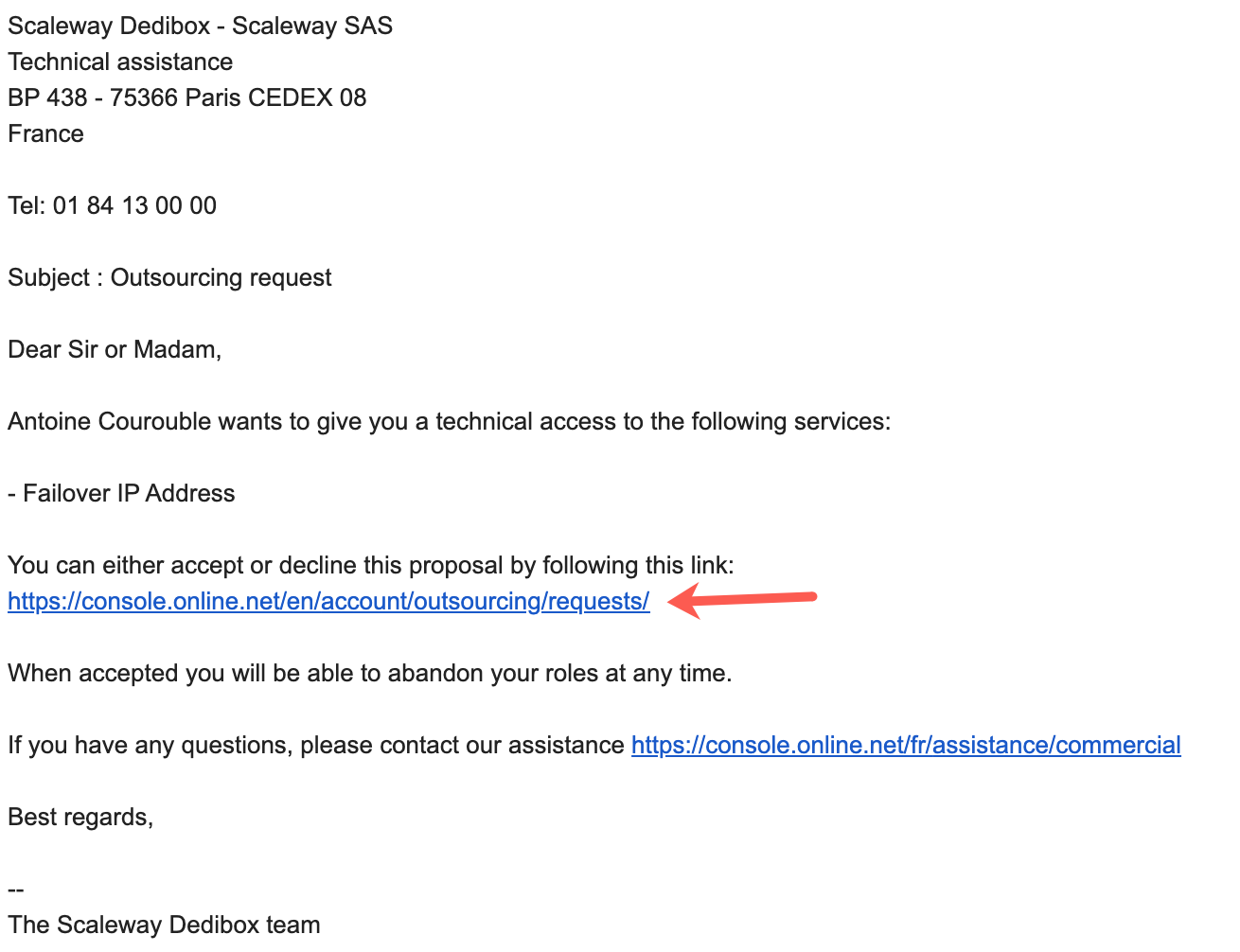 - When another user sends you an outsourcing request, you will receive a notification. Click the link provided in the outsourcing request email to open the Scaleway Dedibox console.