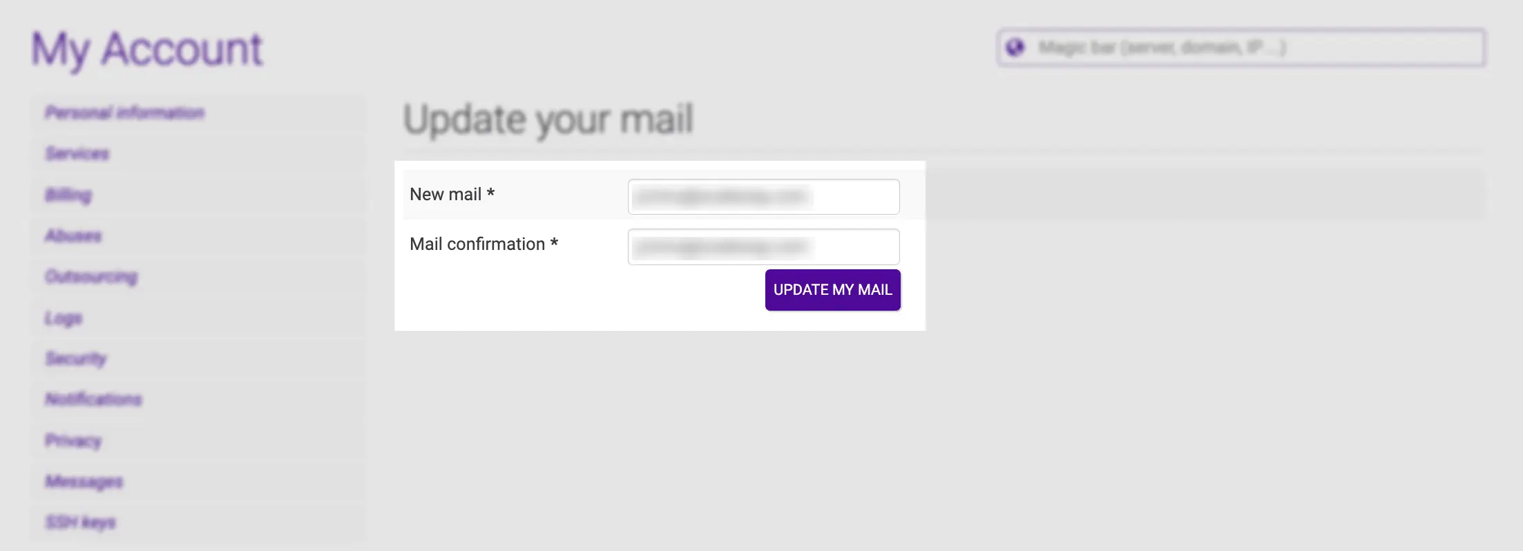 Enter your new email address and its confirmation. Then click Update my mail to submit.