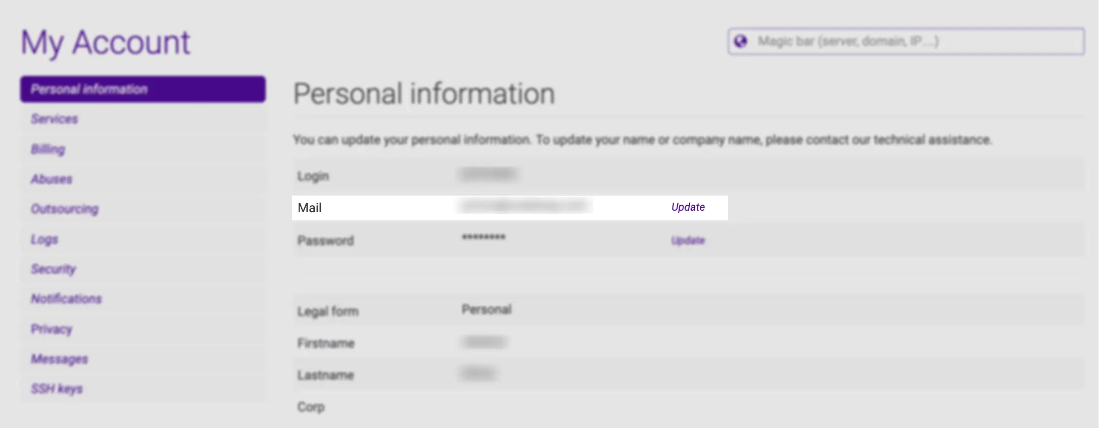 Every Scaleway Dedibox account is associated with a specific email address. In the event that your email address undergoes any changes, you have the option to update this information directly within your account settings.