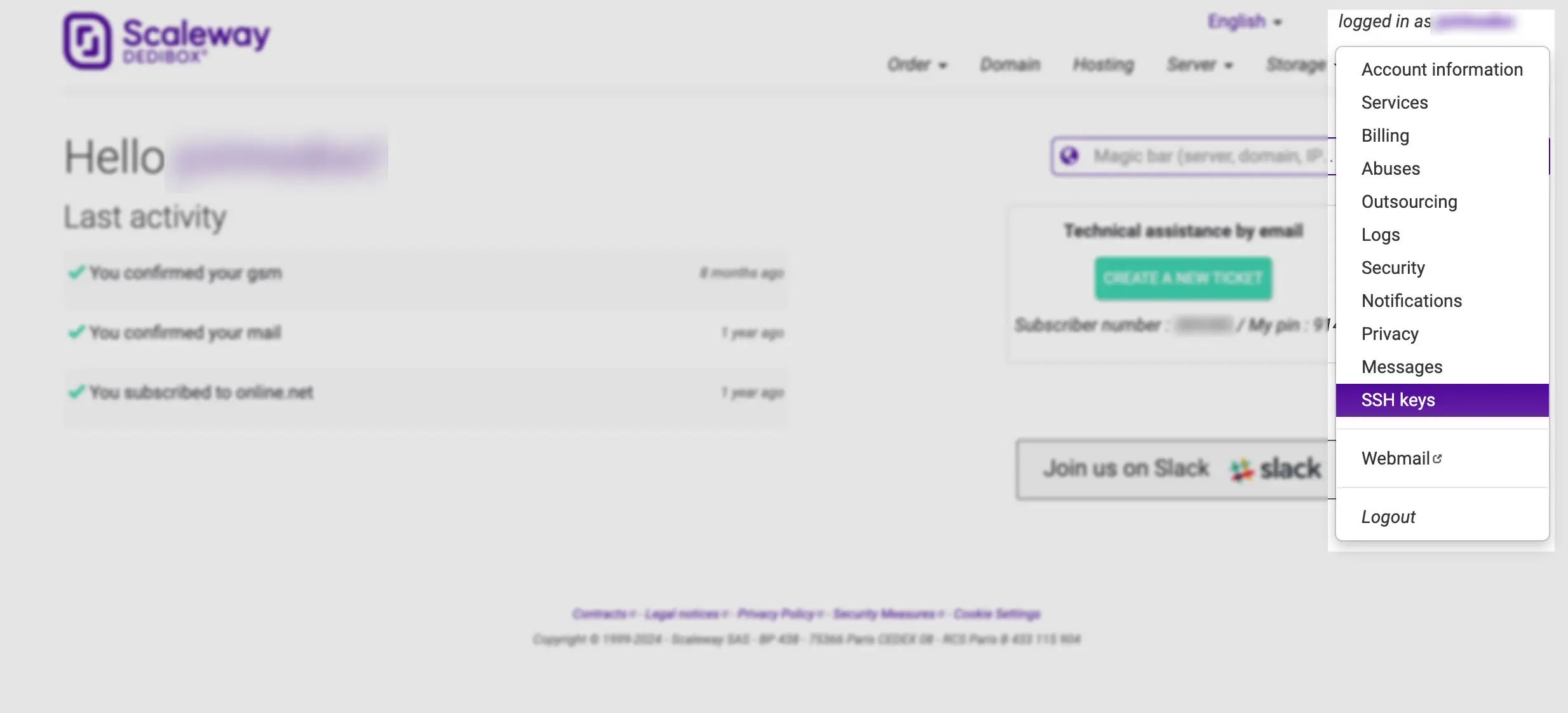 In the top right corner of the Dedibox console, click on your username to open the pop-up menu. From there, select SSH keys.