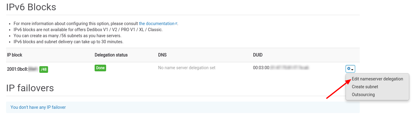You cannot directly edit reverse DNS for IPv4 /27 blocks or IPv6 blocks (/48, /56, /64) in the Dedibox console. Instead, you must delegate these subnets to your nameservers, which will handle the propagation of reverse DNS records on the internet. For redundancy, you need at least two DNS servers, and you can delegate subnets directly from your account.