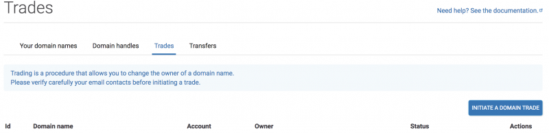 - Click Trades. Trading is the procedure that allows you to change the ownership of a domain.