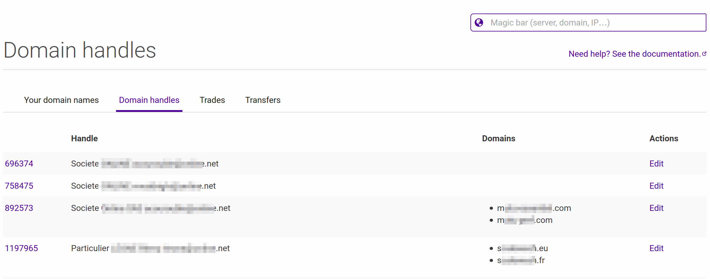 - Click the Domain handles tab. A list of all your handles and their associated domains displays.
