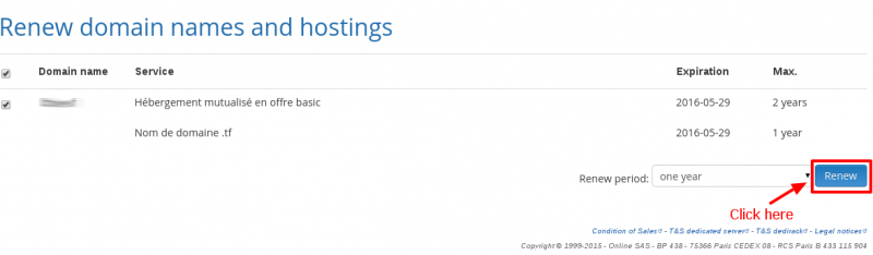 In your browser, navigate to the domain name renewal page. A list of your hosting packages and domain names displays.