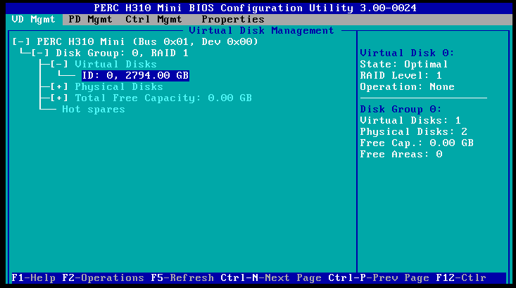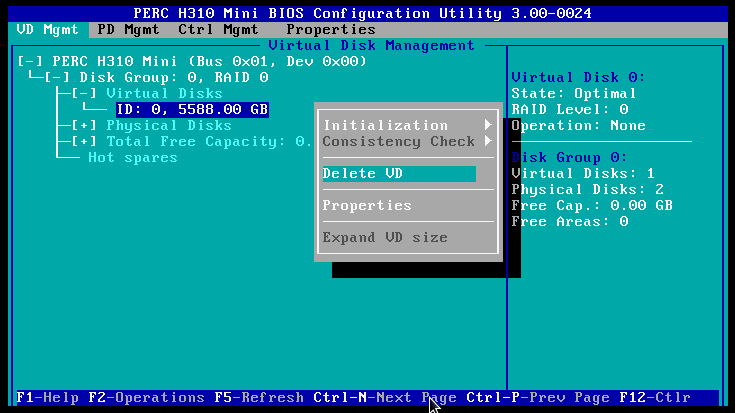- Press F2, then select Delete VD and press enter to delete the virtual disk:
