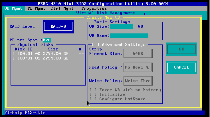 - Create a new virtual disk by selecting No configuration present. The following screen displays, allowing you to configure a new virtual disk: