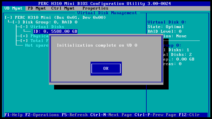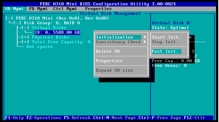 - Return to the main menu and select the virtual disk. Then press F2, and select Fast Init. and press enter to initialize the virtual disk: