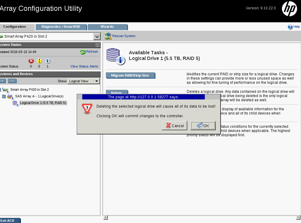 Click Delete to delete the existing virtual disk. A pop-up displays. Click OK to confirm deletion of the logical drive: