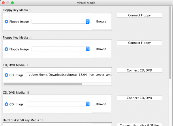 - Click Browse in the CD/DVD Media I section and select your operating system's ISO file. Then click Connect CD/DVD: