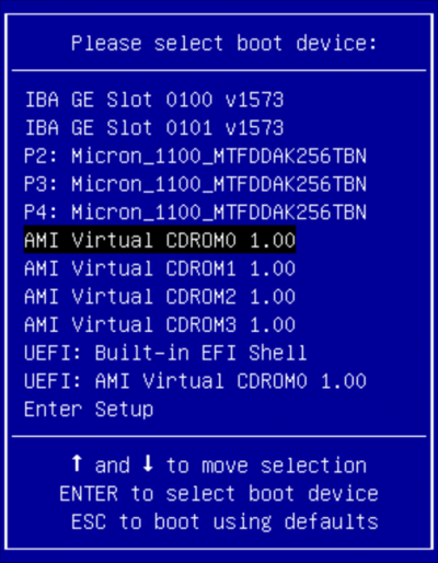 - Select the boot device AMI Virtual CDROM0 to boot from the ISO file: