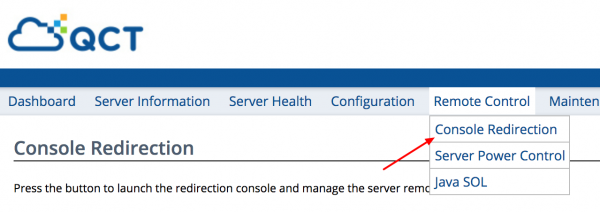 - Click Remote Control > Console Redirection in the menu. Download and run the Java applet.