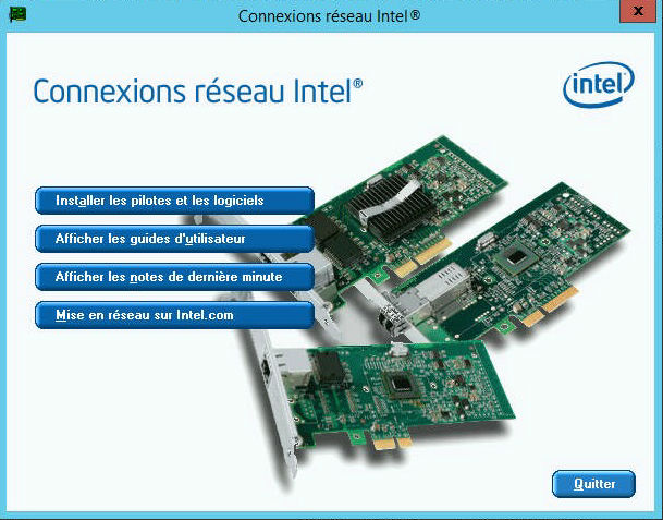 - Double-click on the CD-ROM drive in your Windows installation and launch the setup tool. Accept the terms and conditions and click Intel PRO Network Connections Drivers: