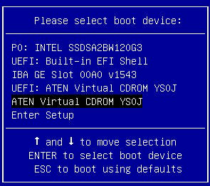 Select the boot device ATEN Virtual CDROM to boot from the ISO file. Your server will boot into installation mode.