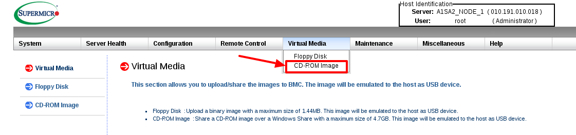 In the KVM menu, click Virtual Media, then CD-ROM Image: