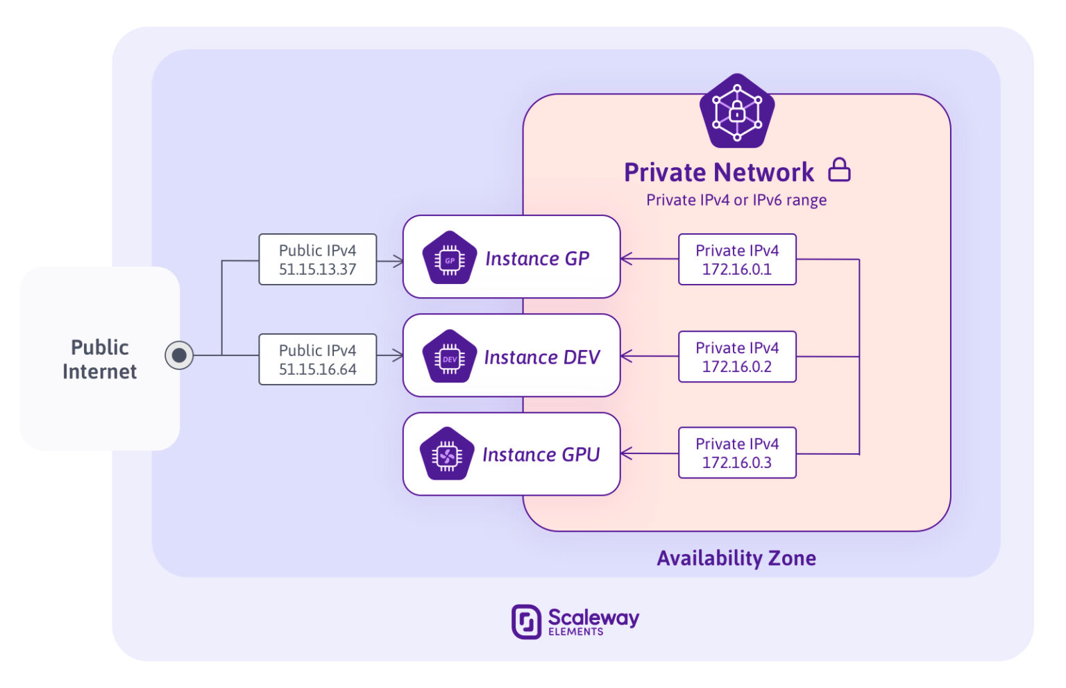 Scaleway offers the Private Networks feature for all Instances, enabling secure, isolated communication within an Availability Zone, independent of the Internet. These Private Networks function as layer 2 Ethernet networks.