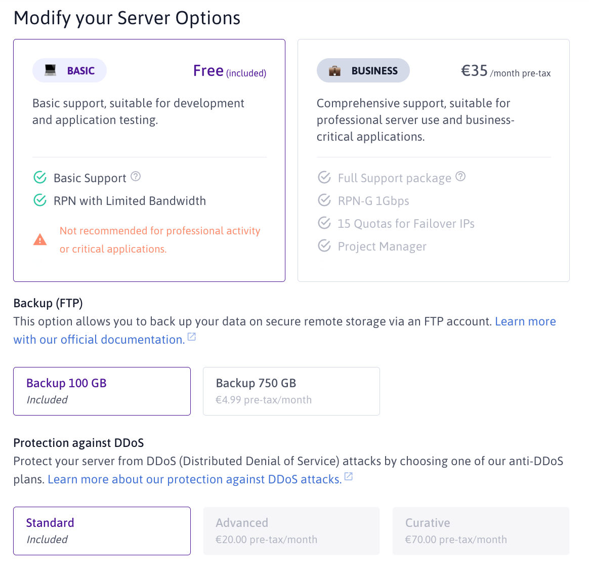 Modify the service level for your Dedibox as required. Based on the service level you can customize your server with additional options, such as storage or DDoS protection.
