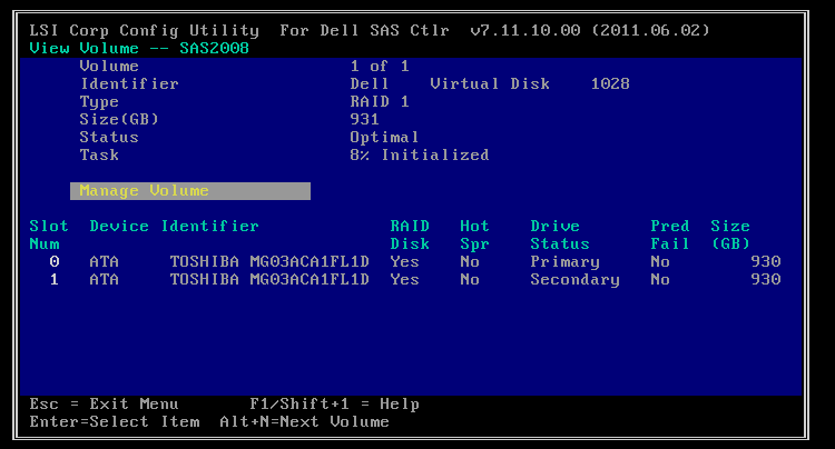 Select RAID Properties and press enter. The RAID configuration displays. Select Manage volume and press Enter.