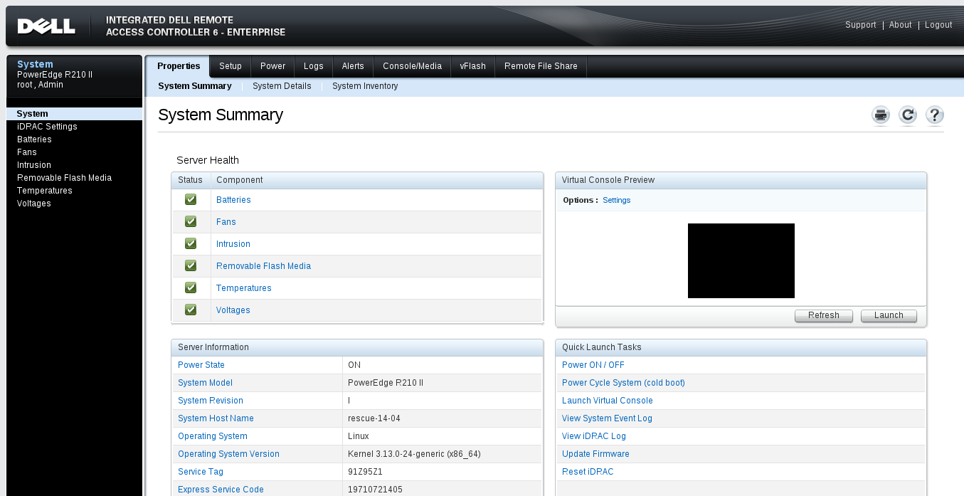 - The System tabs let you view various system information including system details, logs, and power status. You can also use the Console/Media > Virtual Media tab to install your server remotely with a custom OS by connecting virtual media. To launch the KVM, click Remote Access Controller under System Details.