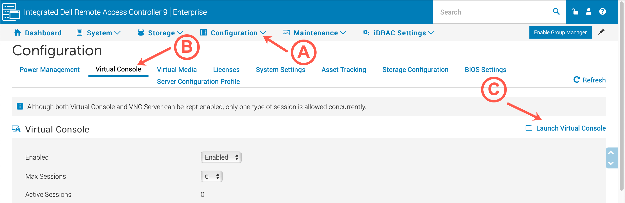 - Click Configuration in the top menu, then Virtual Console. The virtual console page displays. Click Launch Virtual Console.