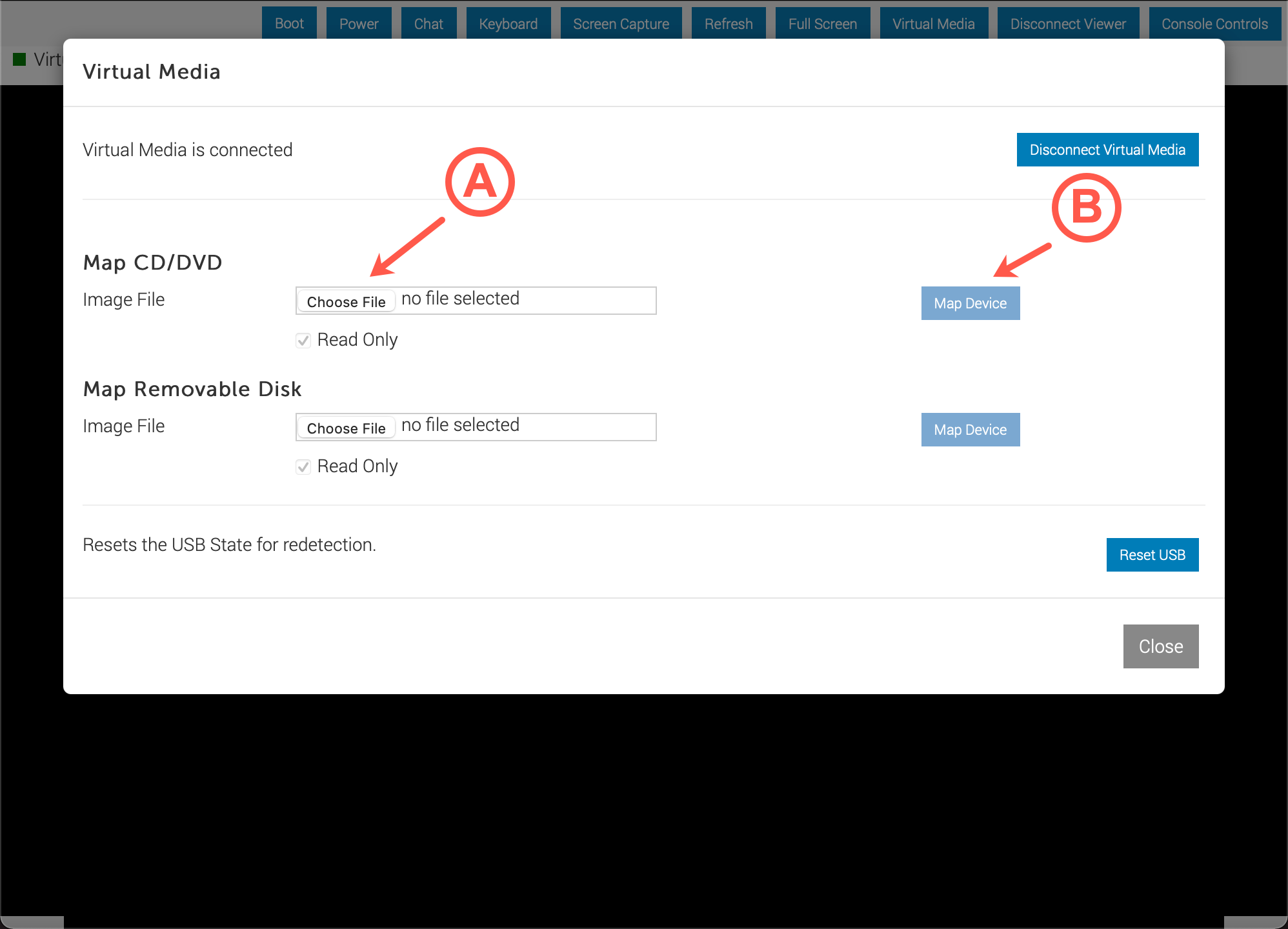 - Click Choose file (A) in the Map CD/DVD section and select your ISO file. Then click Map Device. Once the device is mapped, click Close.