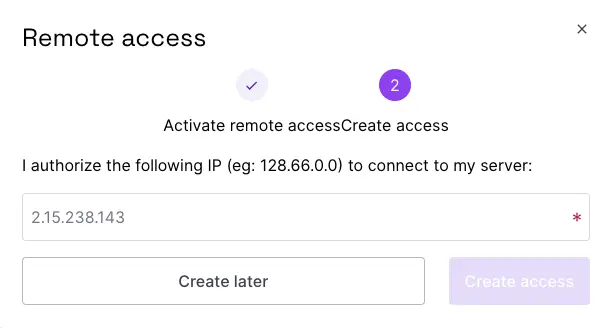 To deactivate the remote access feature, scroll to the Remote access section on your server's information page. Then click Disable remote access.