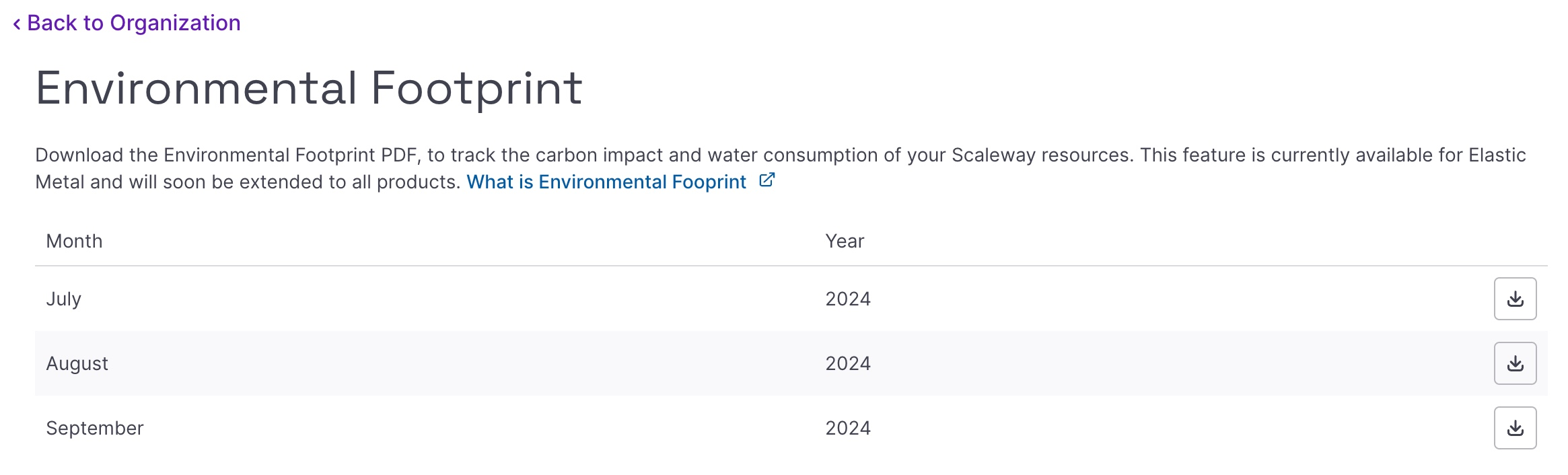 - 3. The total carbon footprint of your Organization per month, which takes into account the impact of the manufacture and use of all the components that run your active Scaleway products in relation to each service's useful life.