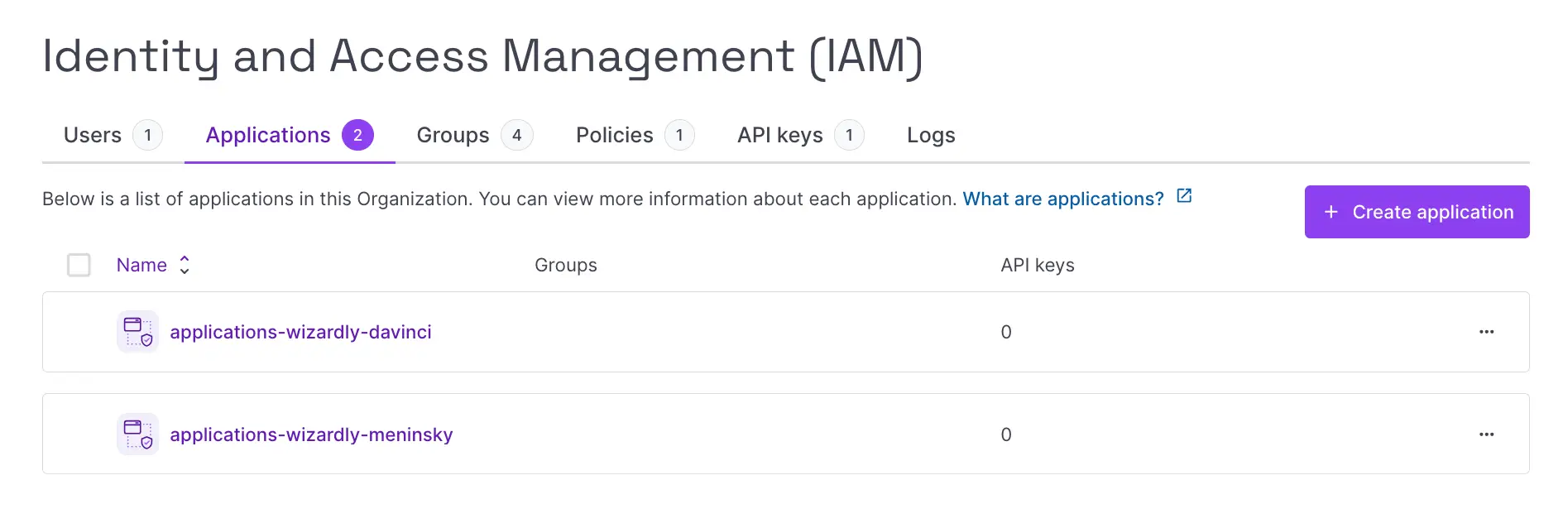 An IAM application is a non-human user in an Organization. This feature lets you create API keys that are not linked to a specific user, to give programmatic access to resources and make your production code more robust. As with users, you can define permissions and access rights for each IAM application via policies.