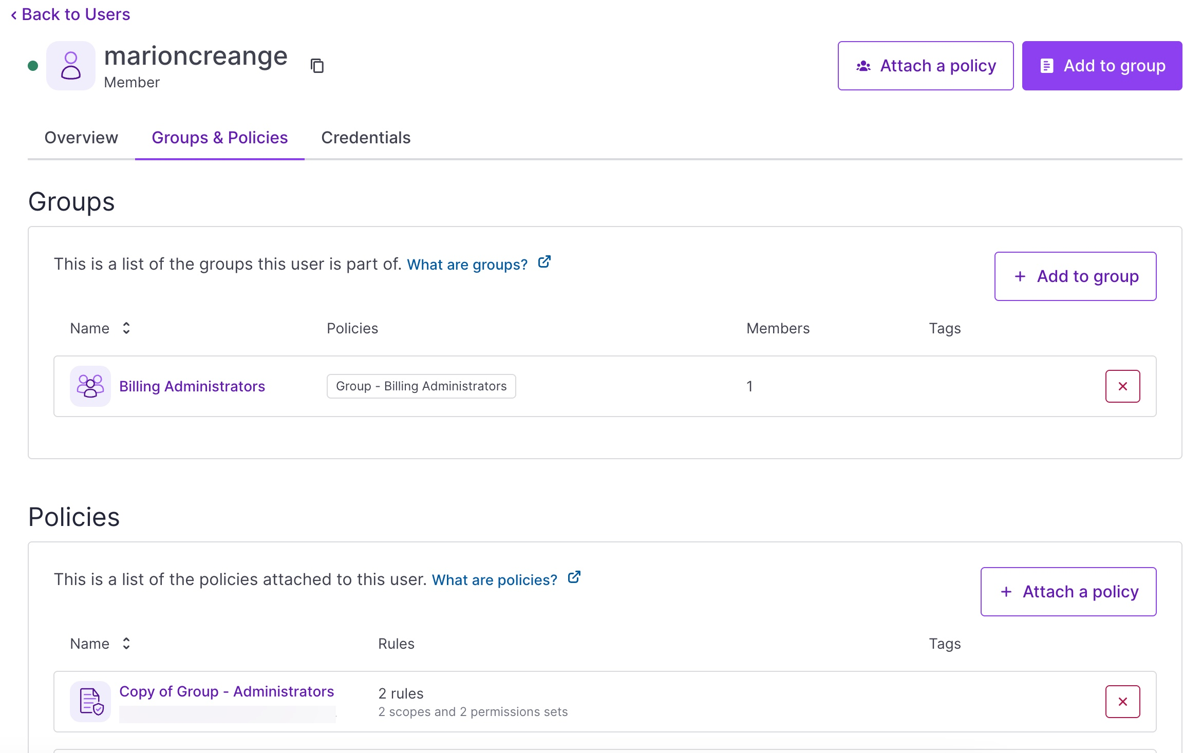- In the Policies panel, click the X button next to the policy you want to detach from the group. A pop-up displays asking you to confirm the action.