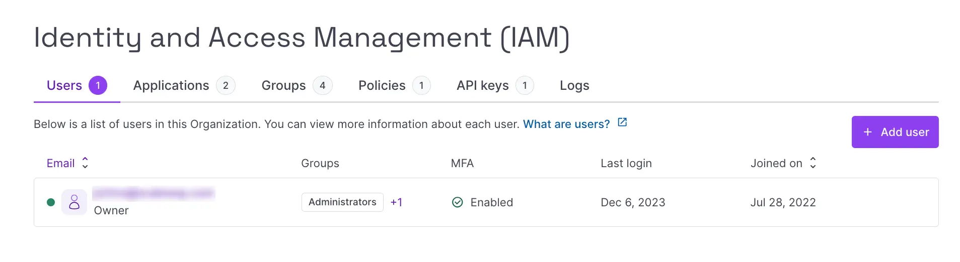 - Click IAM & API keys on the top-right drop-down menu of the Scaleway console. The Users tab of the Identity and Access Management dashboard displays.