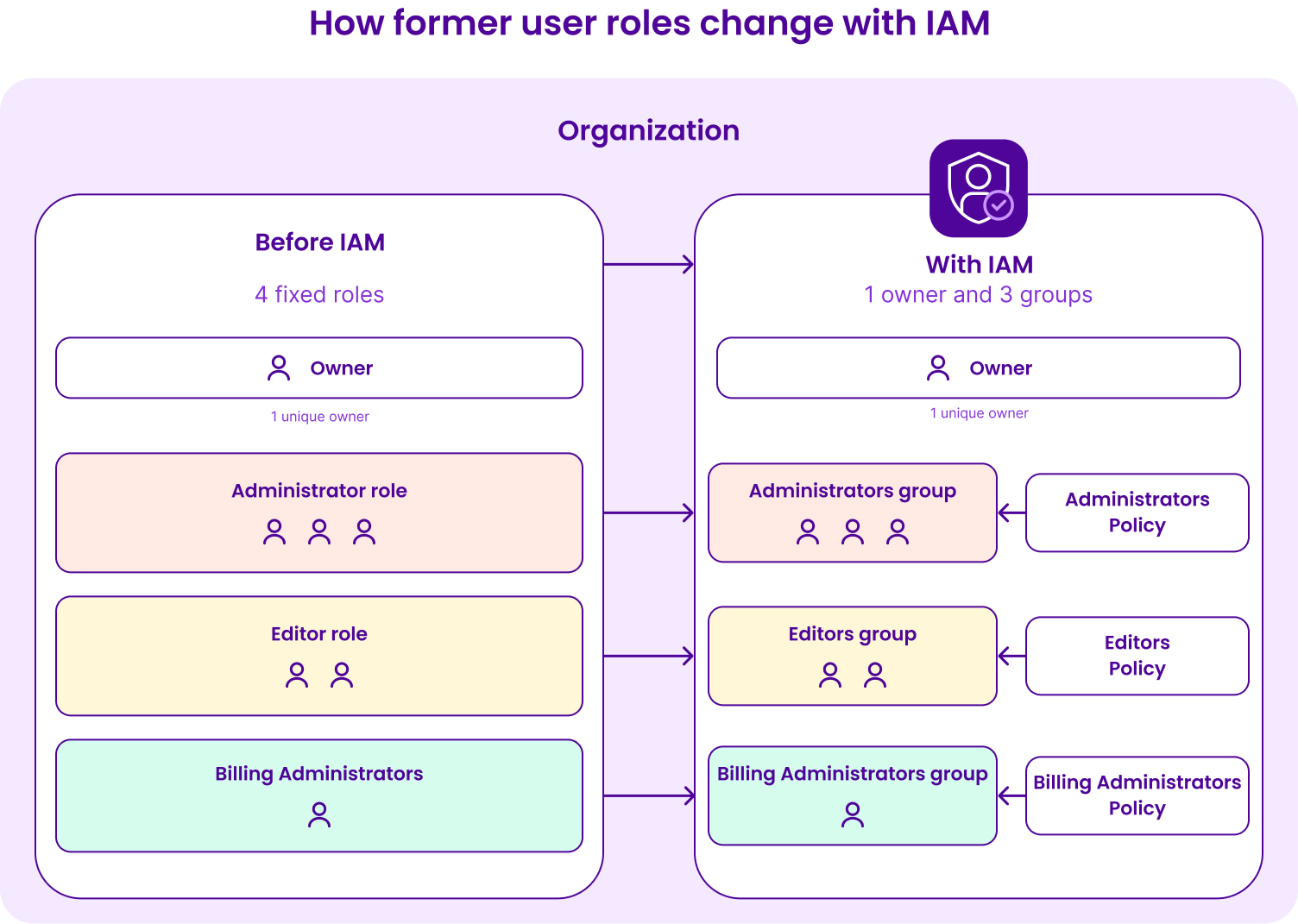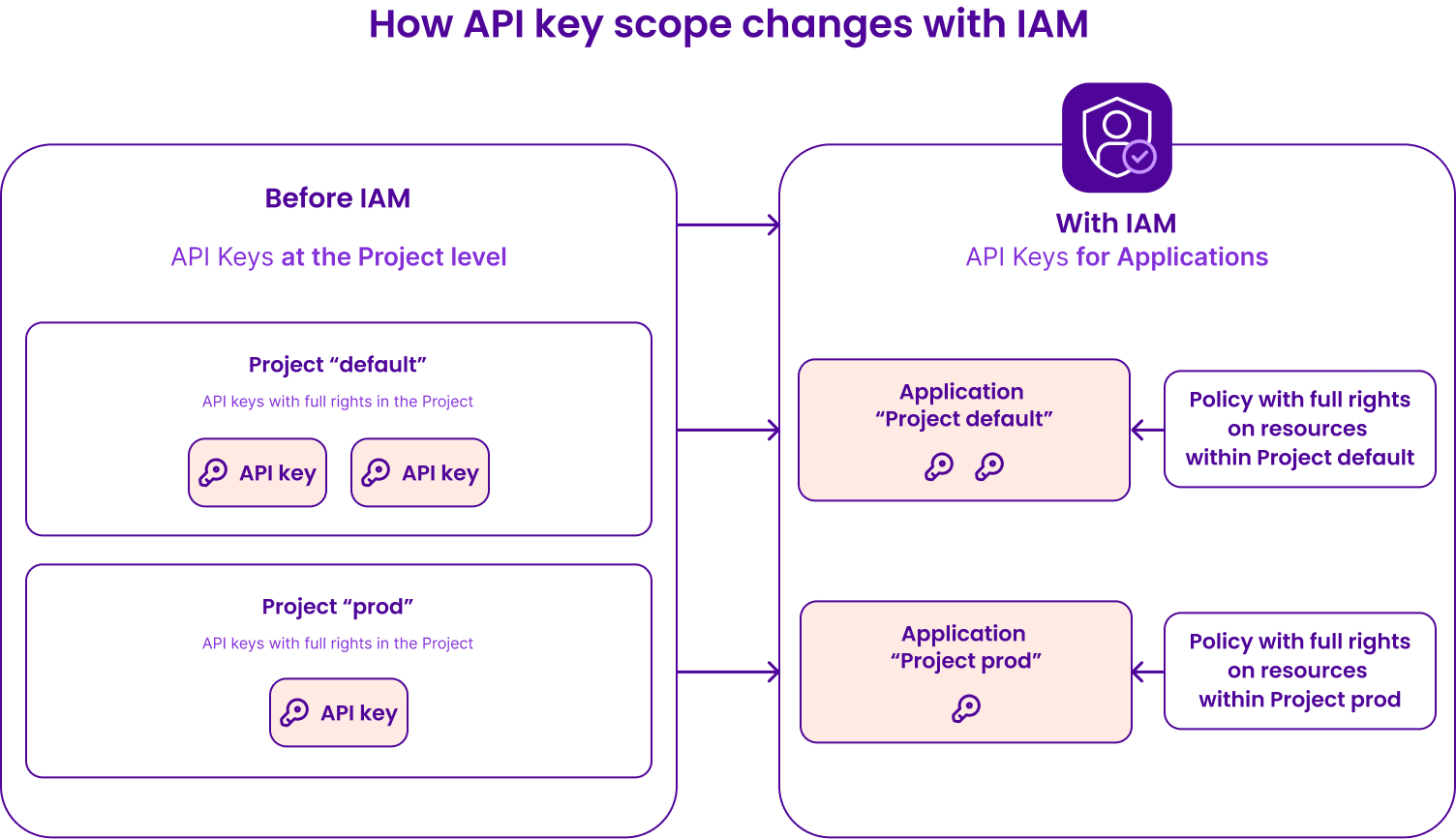 We strongly recommend that you apply the principle of the least privilege when setting up access to the Organization. This means that all users and applications should be able to perform the actions they need, but not more. This principle is best achieved by using all available IAM features to define granular permissions for users and API keys. However, to make the migration from the “old” system to the new one easier, on this page we explain how you can reproduce the former system (roles and Project-scoped API keys) under IAM.