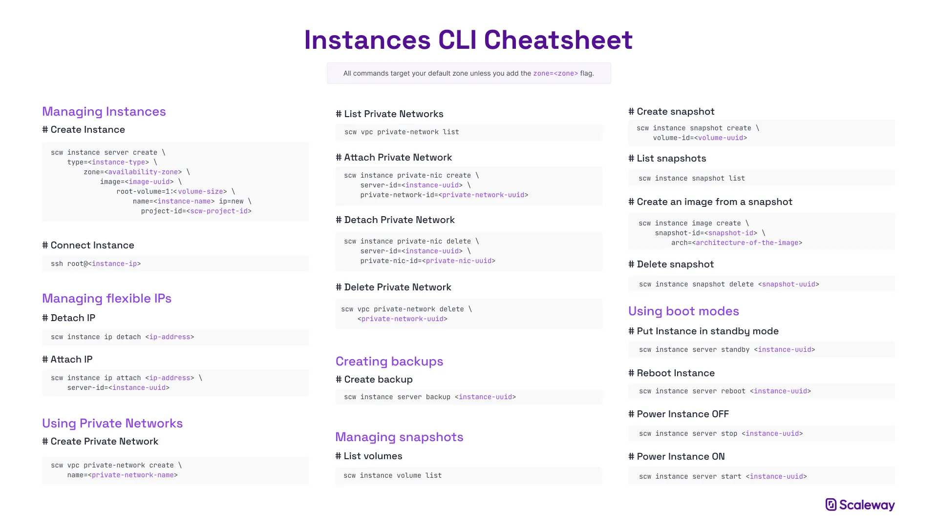 This page shows the most common Scaleway CLI commands for creating and managing Scaleway Instances.