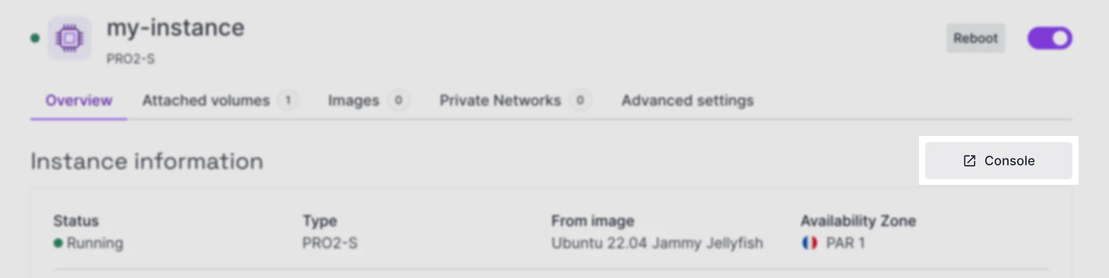 This page shows how to connect to your Scaleway Instance from the Scaleway console using the serial console (TTY, from TeleTYpewriter). It provides a way to connect to your Instance for debugging, or if it loses its network connectivity. The serial console remains available even if you can not reach your Instance over the internet.