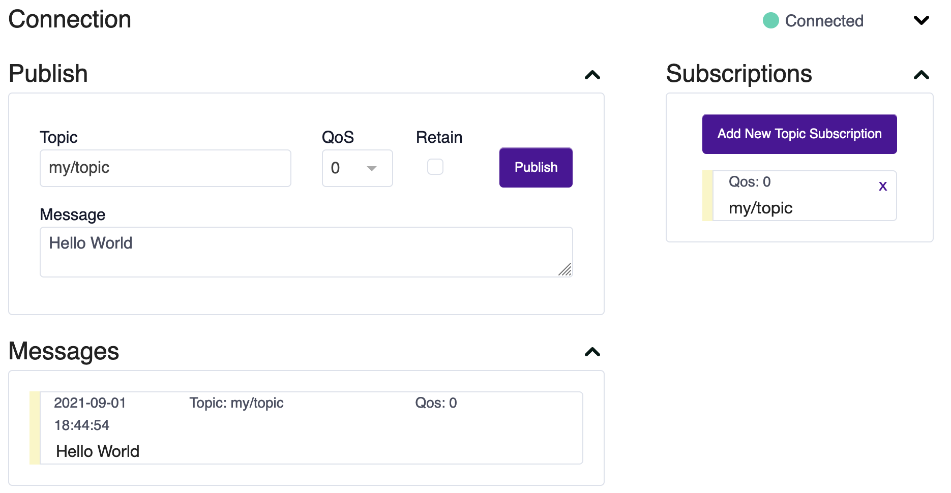 4. Write my/topic under the Topic field, and Hello World in the Message field in the Publish panel. Then, click Publish.
