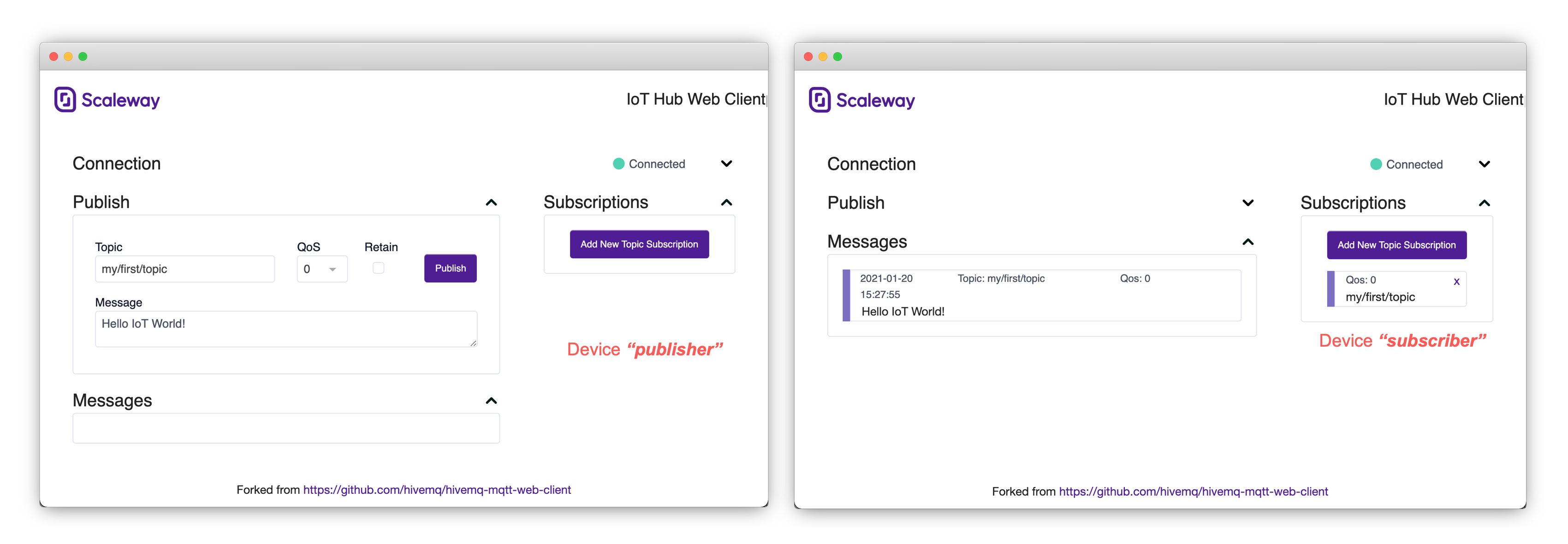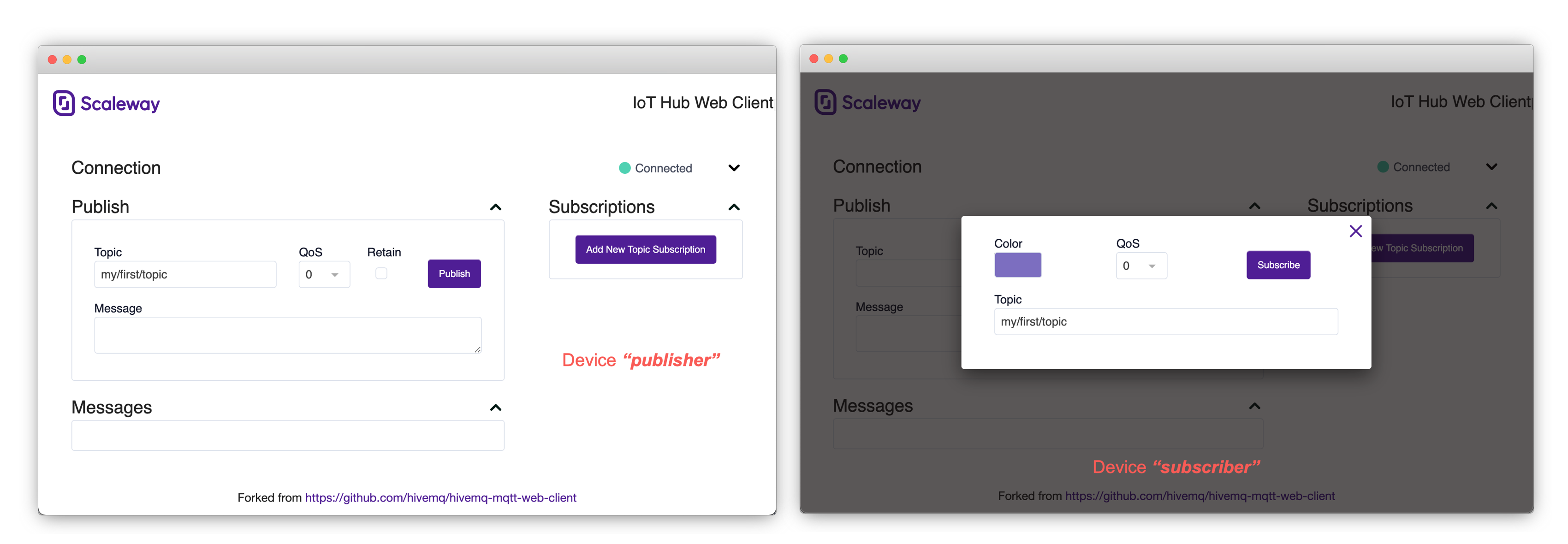 Go back to the devices overview and repeat the steps above for the second device. You now have two MQTT webclients open, one for the publisher and one for the subscriber. The client connects automatically to its associated device. Now that the 2 clients are connected, set up the subscription: