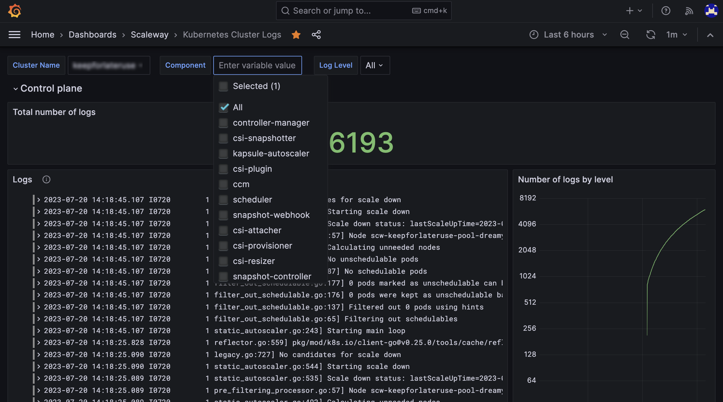 - Click Kubernetes cluster logs in the list of dashboards. A listing of your control plane logs displays. This dashboard allows you to view the logs of multiple components of your Kubernetes cluster, such as the