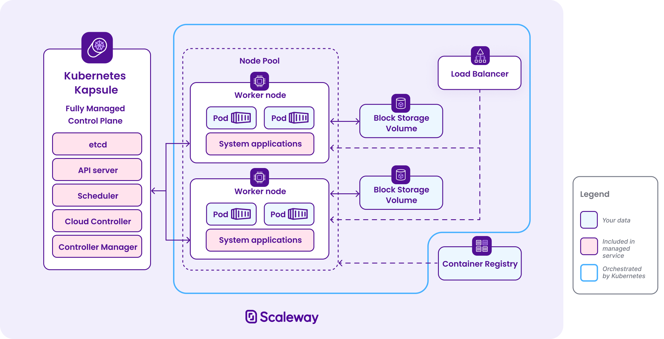 Scaleway manages the Kubernetes control plane (either Kapsule or Kosmos), which consists of various components responsible for managing and maintaining the cluster and its state, and scheduling applications. This includes components such as the control plane itself: etcd, API server, scheduler, cloud controller, and controller manager.