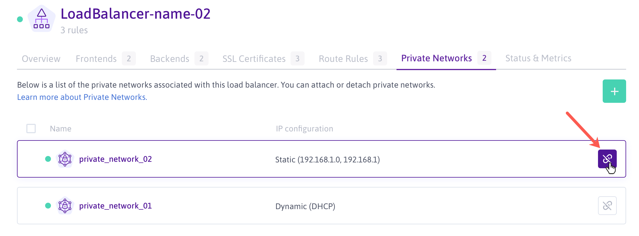 - Click the unlink icon button next to the Private Network that you want to detach from the Load Balancer, then click Detach resource when prompted.