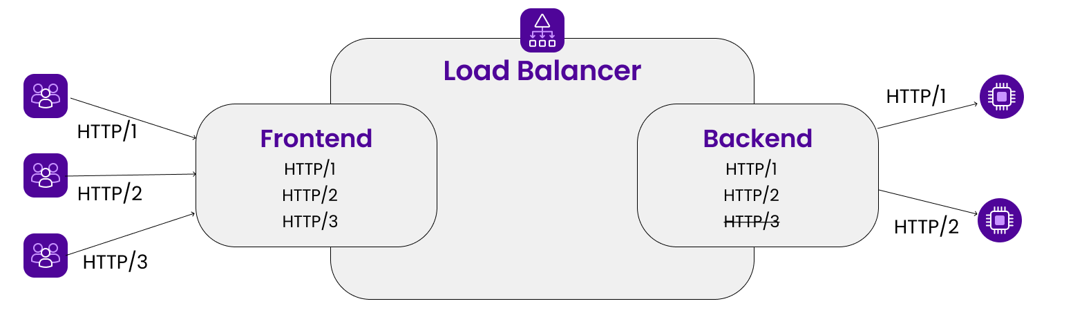 Backends and frontends of Scaleway Load Balancers support HTTP/1, HTTP/2 and HTTP/3 differently, depending on their TLS configuration:
