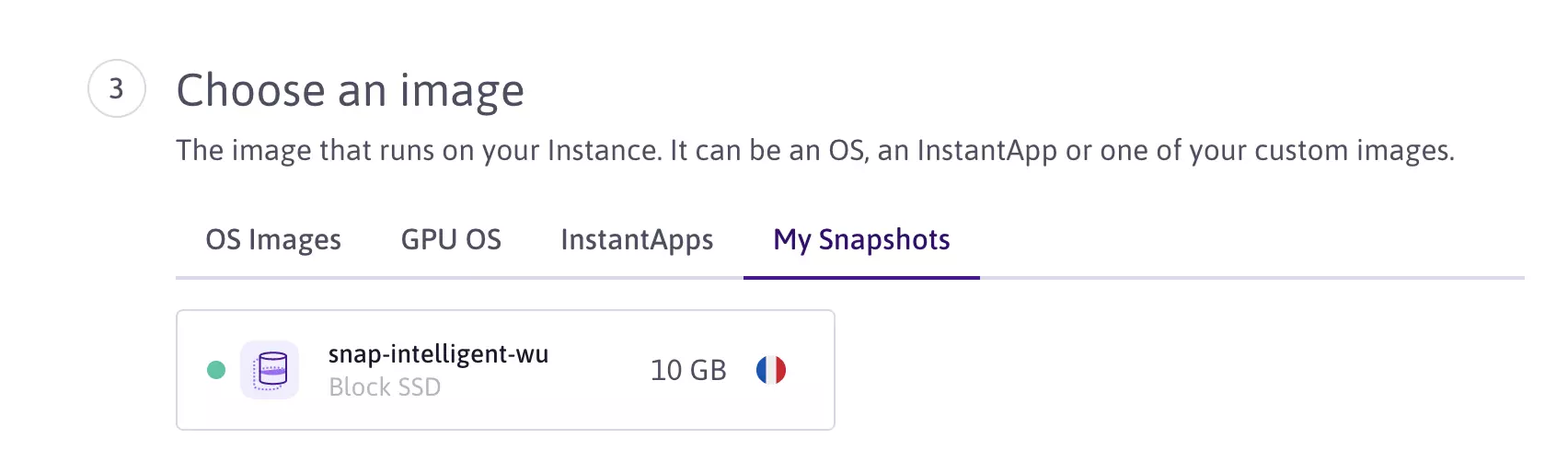 Follow the instructions for creating an Instance. At the Choose an image step of the creation wizard, click the My snapshots tab, and select the desired snapshot.