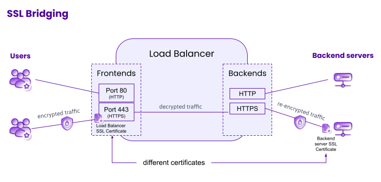 SSL bridging allows the user to initiate a secure, encrypted connection with the Load Balancer thanks to the Load Balancer frontend's SSL certificate. The Load Balancer decrypts incoming HTTPS traffic. This allows the Load Balancer to carry out layer 7 actions on the received traffic. The Load Balancer's backend then initiates a new encrypted connection to re-encrypt traffic between the Load Balancer and the backend server, this time using the backend server's certificate.
