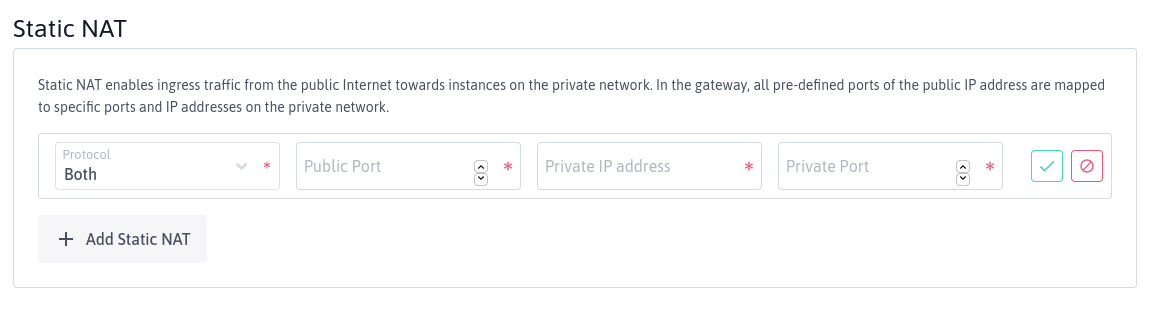 Use the toggle to deactivate dynamic NAT if desired. To add a new static NAT configuration for any Private Network attached to this gateway, click Add Static NAT. The following screen displays: