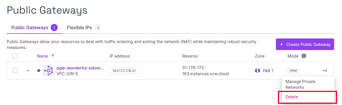 1. Click Public Gateways in the Network section of the Scaleway console side menu. A listing of your Public Gateways displays.