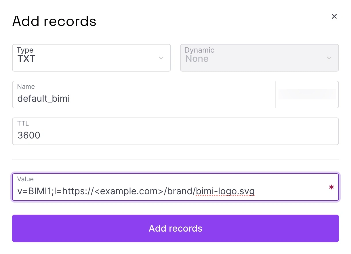 Field Value Notes Type TXT Name default._bimi.<example.com>At Scaleway your domain name is added automatically, so you only need to add default._bimi. Other DNS clients might require you to add the entire address.TTL 3600 seconds We recommend you set TTL to 1 hour (3600 seconds) Value v=BIMI1;l=<https://example.com/brand/bimi-logo.svg>Replace <https://example.com/brand/bimi-logo.svg>with the URL leading to the SVG logo file. -