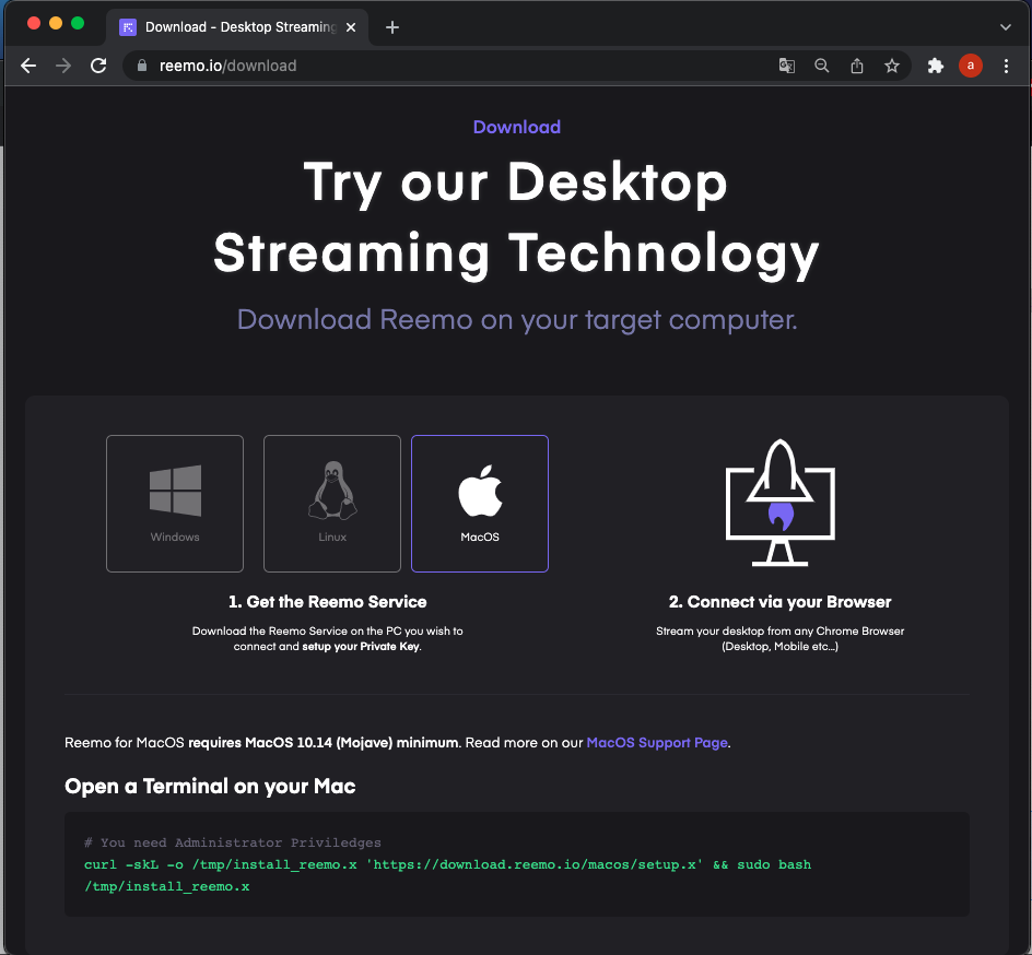 # For older MacOS version (pre ventura) you can install this audio driver for audio capture support brew install blackhole-2ch # You need Administrator Privileges curl -skL -o /tmp/install_reemo.x 'https://download.reemo.io/macos/setup.x' && sudo bash /tmp/install_reemo.x - Enter the private key of your Reemo account when prompted. Press Enter to validate.
